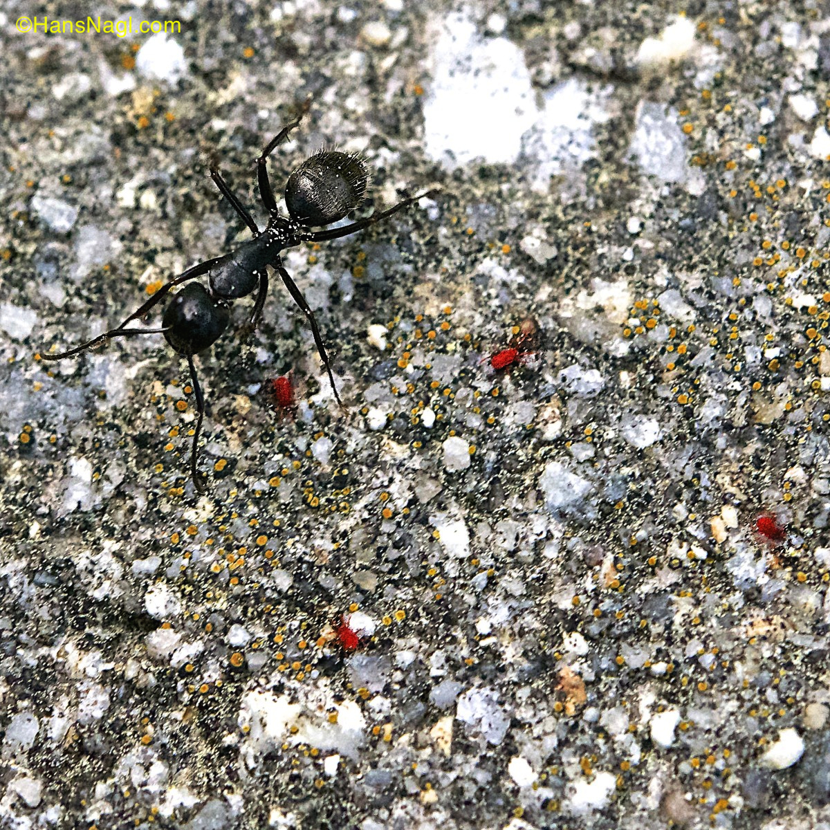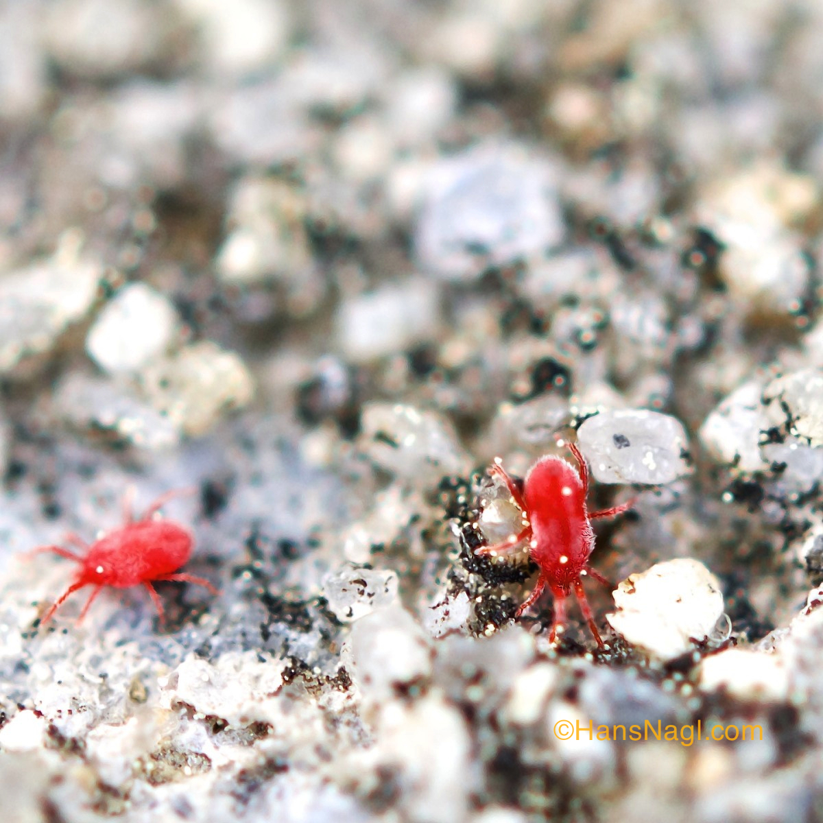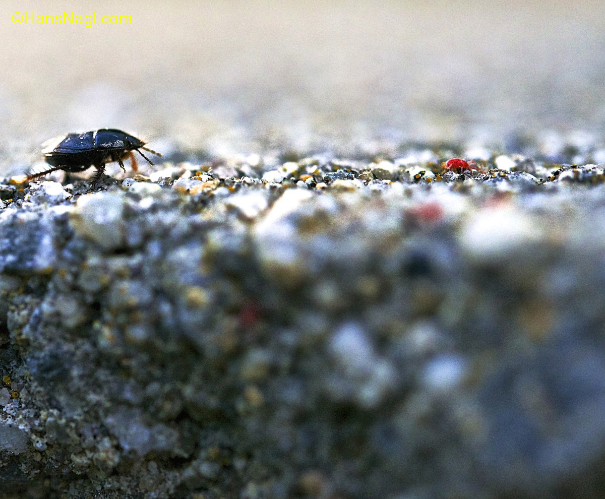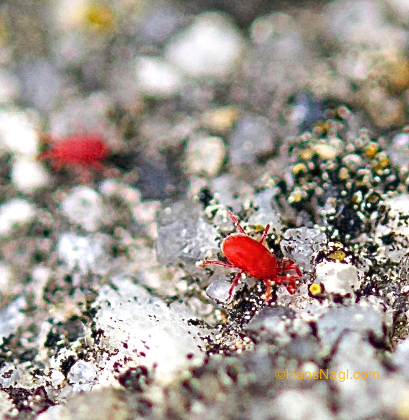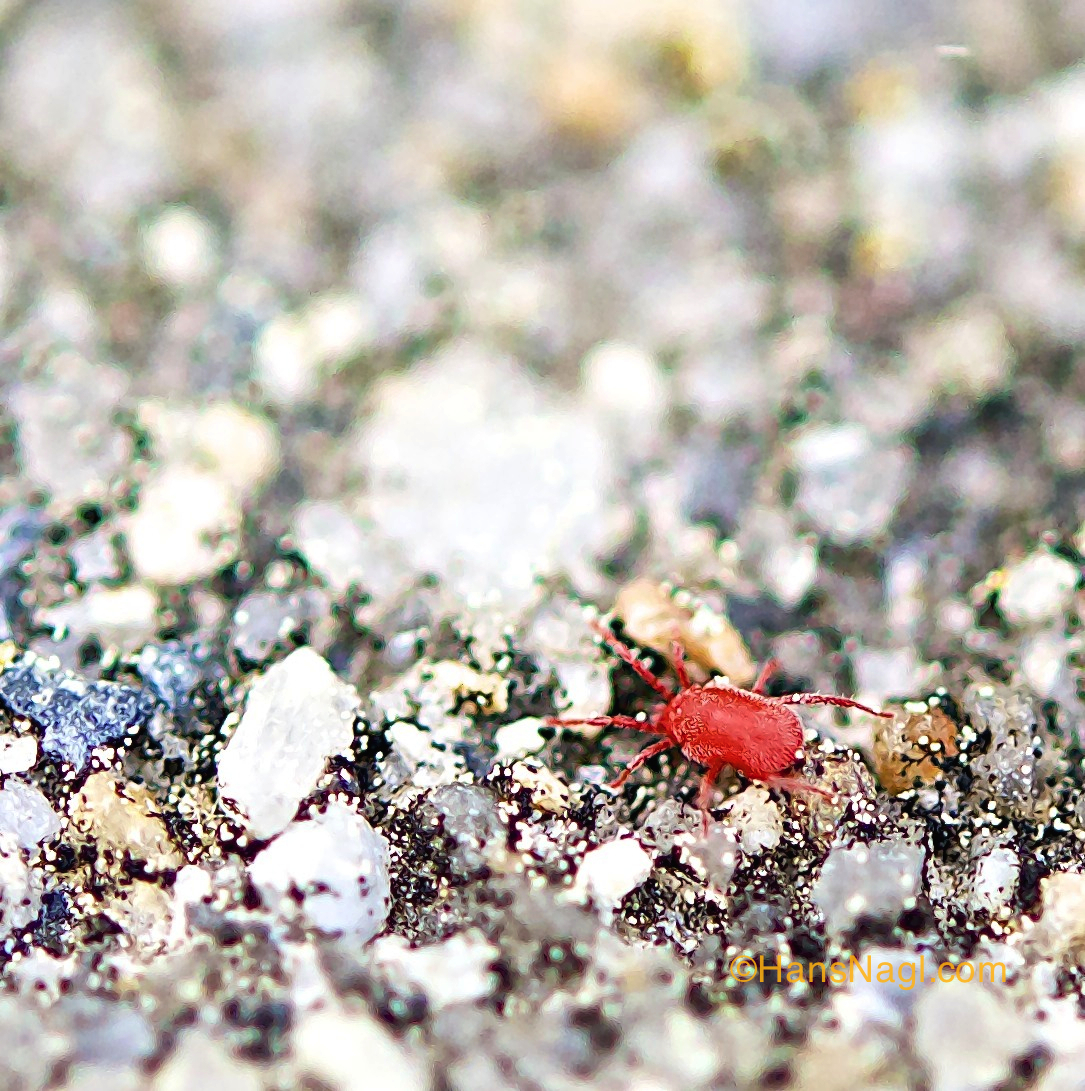 A couple of days ago I had the opportunity to watch red clover mites, less than a millimeter large spider like creatures. They appeared as tiny red dots restlessly moving on top of a concrete wall close to our vegetable garden. Needless to say they immediately became targets for a photo session.